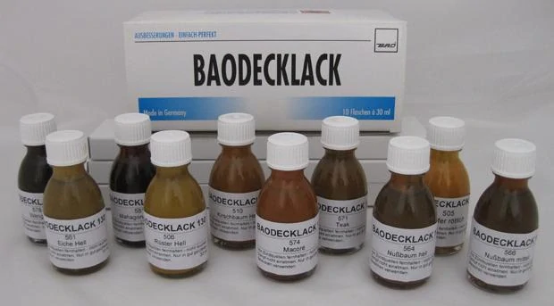 Jedná se o vysoce kvalitní profesionální sadu retušovacích barev na bázi NC laků, určenou pro krycí retuše dřevěných a plastových povrchů, nábytku a podobných materiálů. Lak je vhodný i pro aplikaci na místa předem ošetřená voskovými tmely, kde slouží jako finální dekorativní úprava.