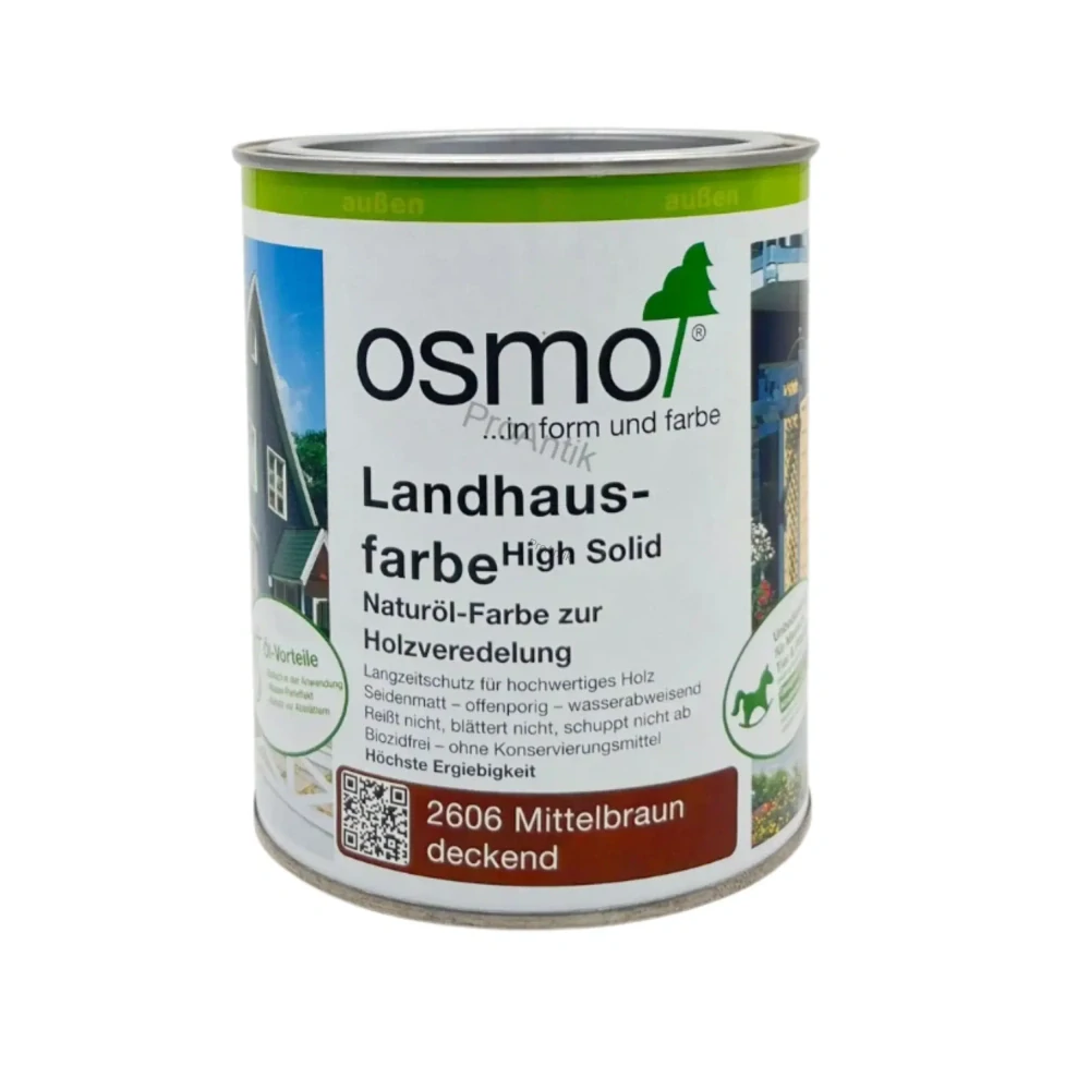 Osmo Selská barva je krycí olejová barva určená pro venkovní dřevo. Vytváří neprůhledný nátěr s hedvábně lesklým až polomatným povrchem, který spolehlivě chrání proti povětrnosti, vodě i UV záření. Díky mikroporéznímu složení nechává dřevo „dýchat“, neodlupuje se a nepraská. Renovace je snadná – stačí prostý přetěr bez broušení. Barva je vhodná na fasády, chaty, ploty, pergoly, zahradní nábytek či okna a okenice. Lze ji míchat a tónovat podle RAL/NCS.